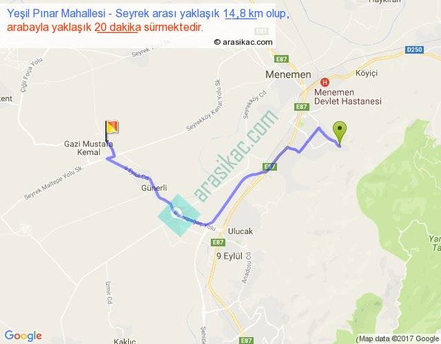 Yeşil Pınar Mahallesi - Seyrek arası yaklaşık olarak 90 km/h ile yukarıda belirtilen sürede olup, iki yerin kuş uçuşu uzaklığı (mesafesi) 10'dir. Yolculuk otobüsle 26 dakika sürmektedir.
