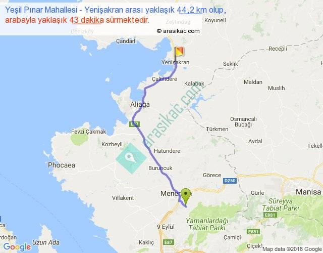 Yeşil Pınar Mahallesi - Yenişakran arası yaklaşık olarak 90 km/h ile yukarıda belirtilen sürede olup, iki yerin kuş uçuşu uzaklığı (mesafesi) 34'dir. Yolculuk otobüsle 55 dakika sürmektedir.