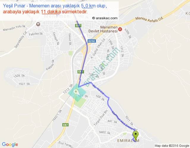 Yeşil Pınar - Menemen arası yaklaşık olarak 90 km/h ile yukarıda belirtilen sürede olup, iki yerin kuş uçuşu uzaklığı (mesafesi) 4'dir. Yolculuk otobüsle 14 dakika sürmektedir.