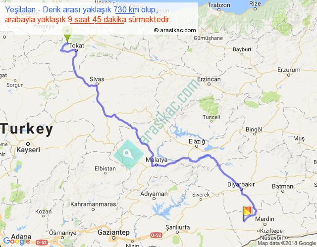 Yeşilalan - Derik arası yaklaşık olarak 90 km/h ile yukarıda belirtilen sürede olup, iki yerin kuş uçuşu uzaklığı (mesafesi) 478'dir. Eğer belirtilen yerler arasında uçak seferi var ise bu süre uçakla 44 dakika'ya kadar düşebilir. Yolculuk otobüsle 12 saat 40 dakika sürmektedir.