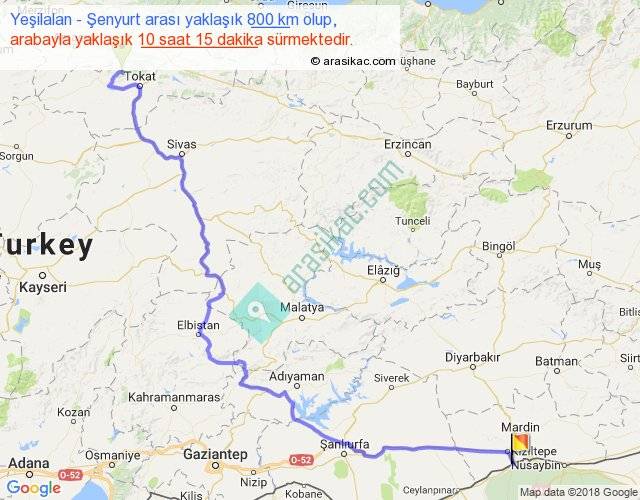 Yeşilalan - Şenyurt arası yaklaşık olarak 90 km/h ile yukarıda belirtilen sürede olup, iki yerin kuş uçuşu uzaklığı (mesafesi) 524'dir. Eğer belirtilen yerler arasında uçak seferi var ise bu süre uçakla 48 dakika'ya kadar düşebilir. Yolculuk otobüsle 13 saat 19 dakika sürmektedir.