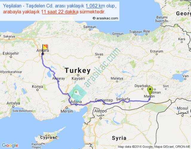 Yeşilalan - Taşdelen Cd. arası yaklaşık olarak 90 km/h ile yukarıda belirtilen sürede olup, iki yerin kuş uçuşu uzaklığı (mesafesi) 734'dir. Eğer belirtilen yerler arasında uçak seferi var ise bu süre uçakla 1 saat 07 dakika'ya kadar düşebilir. Yolculuk otobüsle 14 saat 46 dakika sürmektedir.
