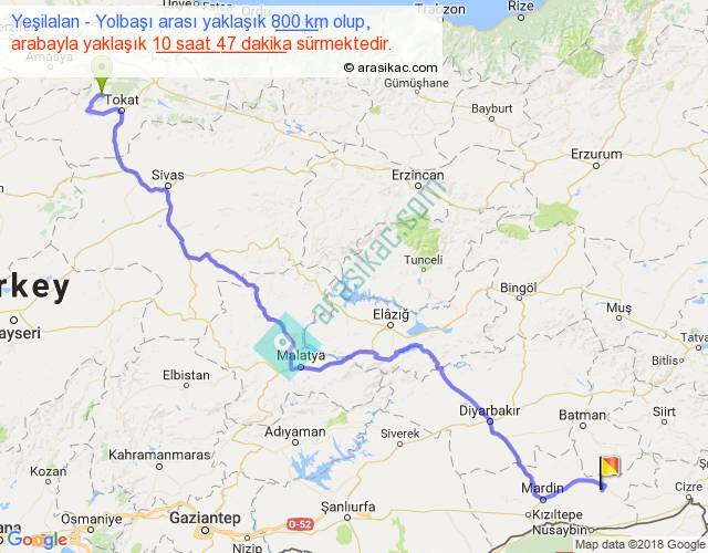 Yeşilalan - Yolbaşı arası yaklaşık olarak 90 km/h ile yukarıda belirtilen sürede olup, iki yerin kuş uçuşu uzaklığı (mesafesi) 544'dir. Eğer belirtilen yerler arasında uçak seferi var ise bu süre uçakla 50 dakika'ya kadar düşebilir. Yolculuk otobüsle 14 saat 1 dakika sürmektedir.