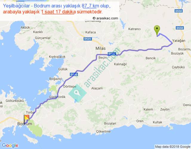 Yeşilbağcılar - Bodrum arası yaklaşık olarak 90 km/h ile yukarıda belirtilen sürede olup, iki yerin kuş uçuşu uzaklığı (mesafesi) 64'dir. Yolculuk otobüsle 1 saat 40 dakika sürmektedir.