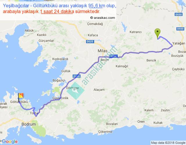 Yeşilbağcılar - Göltürkbükü arası yaklaşık olarak 90 km/h ile yukarıda belirtilen sürede olup, iki yerin kuş uçuşu uzaklığı (mesafesi) 63'dir. Yolculuk otobüsle 1 saat 49 dakika sürmektedir.