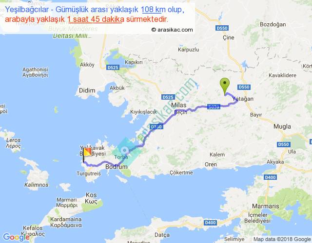 Yeşilbağcılar - Gümüşlük arası yaklaşık olarak 90 km/h ile yukarıda belirtilen sürede olup, iki yerin kuş uçuşu uzaklığı (mesafesi) 78'dir. Yolculuk otobüsle 2 saat 16 dakika sürmektedir.