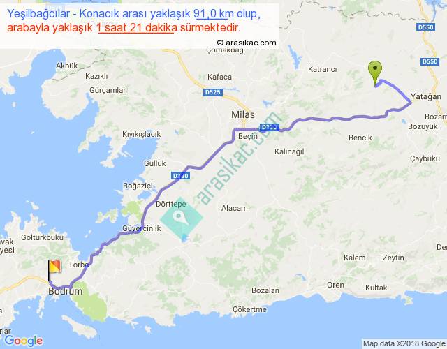 Yeşilbağcılar - Konacık arası yaklaşık olarak 90 km/h ile yukarıda belirtilen sürede olup, iki yerin kuş uçuşu uzaklığı (mesafesi) 66'dir. Yolculuk otobüsle 1 saat 45 dakika sürmektedir.