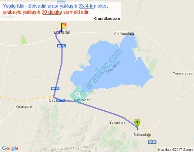 Yeşilçiftlik - Bolvadin arası yaklaşık olarak 90 km/h ile yukarıda belirtilen sürede olup, iki yerin kuş uçuşu uzaklığı (mesafesi) 24'dir. Yolculuk otobüsle 39 dakika sürmektedir.