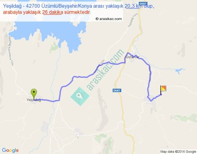 Yeşildağ - 42700 Üzümlü Beyşehir Konya arası yaklaşık olarak 90 km/h ile yukarıda belirtilen sürede olup, iki yerin kuş uçuşu uzaklığı (mesafesi) 12'dir. Yolculuk otobüsle 33 dakika sürmektedir.