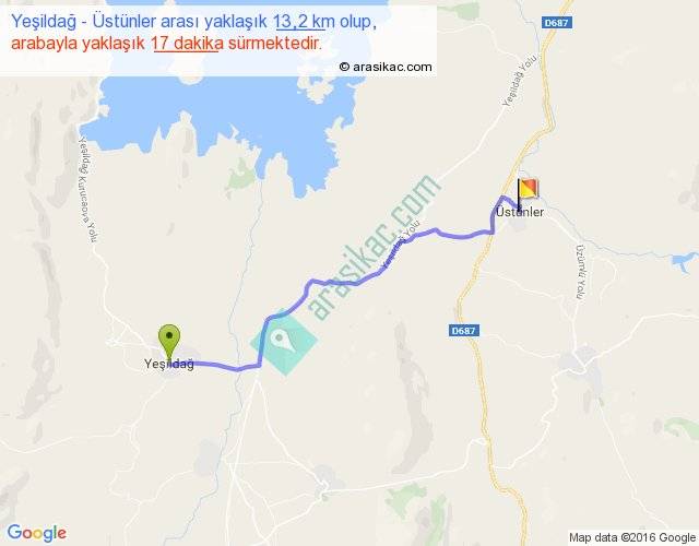 Yeşildağ - Üstünler arası yaklaşık olarak 90 km/h ile yukarıda belirtilen sürede olup, iki yerin kuş uçuşu uzaklığı (mesafesi) 11'dir. Yolculuk otobüsle 22 dakika sürmektedir.