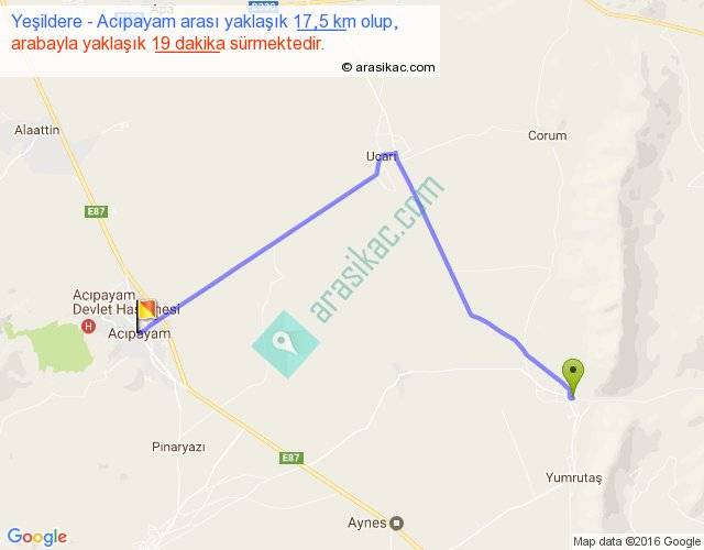 Yeşildere - Acıpayam arası yaklaşık olarak 90 km/h ile yukarıda belirtilen sürede olup, iki yerin kuş uçuşu uzaklığı (mesafesi) 12'dir. Yolculuk otobüsle 24 dakika sürmektedir.