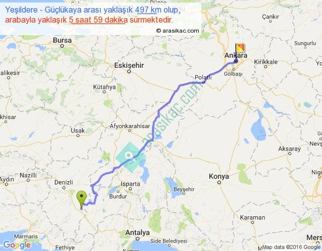 Yeşildere - Güçlükaya arası yaklaşık olarak 90 km/h ile yukarıda belirtilen sürede olup, iki yerin kuş uçuşu uzaklığı (mesafesi) 407'dir. Eğer belirtilen yerler arasında uçak seferi var ise bu süre uçakla 37 dakika'ya kadar düşebilir. Yolculuk otobüsle 7 saat 46 dakika sürmektedir.