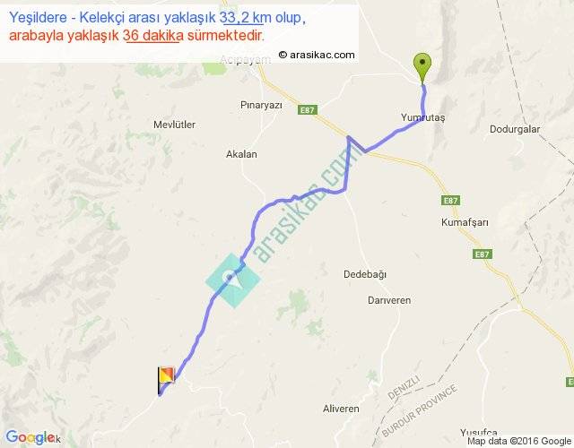Yeşildere - Kelekçi arası yaklaşık olarak 90 km/h ile yukarıda belirtilen sürede olup, iki yerin kuş uçuşu uzaklığı (mesafesi) 27'dir. Yolculuk otobüsle 46 dakika sürmektedir.