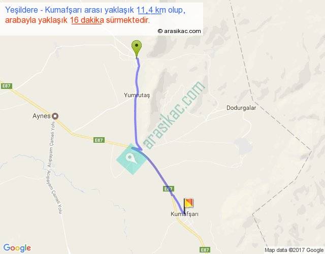 Yeşildere - Kumafşarı arası yaklaşık olarak 90 km/h ile yukarıda belirtilen sürede olup, iki yerin kuş uçuşu uzaklığı (mesafesi) 10'dir. Yolculuk otobüsle 20 dakika sürmektedir.
