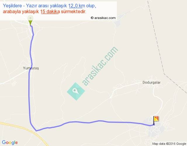 Yeşildere - Yazır arası yaklaşık olarak 90 km/h ile yukarıda belirtilen sürede olup, iki yerin kuş uçuşu uzaklığı (mesafesi) 8'dir. Yolculuk otobüsle 19 dakika sürmektedir.