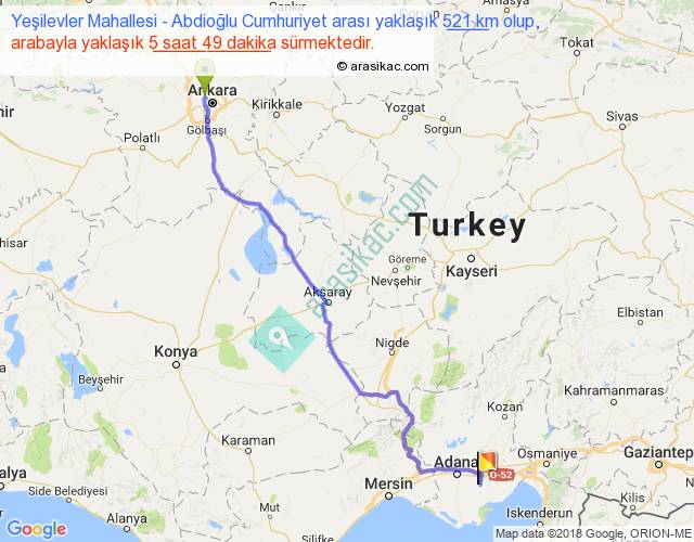 Yeşilevler Mahallesi - Abdioğlu Cumhuriyet arası yaklaşık olarak 90 km/h ile yukarıda belirtilen sürede olup, iki yerin kuş uçuşu uzaklığı (mesafesi) 416'dir. Eğer belirtilen yerler arasında uçak seferi var ise bu süre uçakla 38 dakika'ya kadar düşebilir. Yolculuk otobüsle 7 saat 33 dakika sürmektedir.