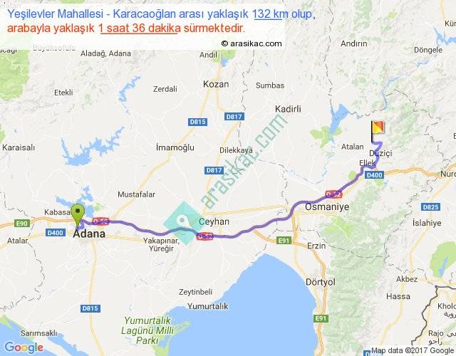 Yeşilevler Mahallesi - Karacaoğlan arası yaklaşık olarak 90 km/h ile yukarıda belirtilen sürede olup, iki yerin kuş uçuşu uzaklığı (mesafesi) 105'dir. Yolculuk otobüsle 2 saat 4 dakika sürmektedir.