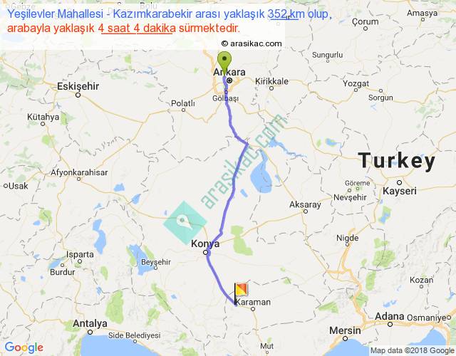 Yeşilevler Mahallesi - Kazımkarabekir arası yaklaşık olarak 90 km/h ile yukarıda belirtilen sürede olup, iki yerin kuş uçuşu uzaklığı (mesafesi) 304'dir. Eğer belirtilen yerler arasında uçak seferi var ise bu süre uçakla 28 dakika'ya kadar düşebilir. Yolculuk otobüsle 5 saat 17 dakika sürmektedir.