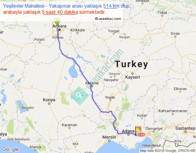 Yeşilevler Mahallesi - Yakapınar arası yaklaşık olarak 90 km/h ile yukarıda belirtilen sürede olup, iki yerin kuş uçuşu uzaklığı (mesafesi) 413'dir. Eğer belirtilen yerler arasında uçak seferi var ise bu süre uçakla 38 dakika'ya kadar düşebilir. Yolculuk otobüsle 7 saat 22 dakika sürmektedir.