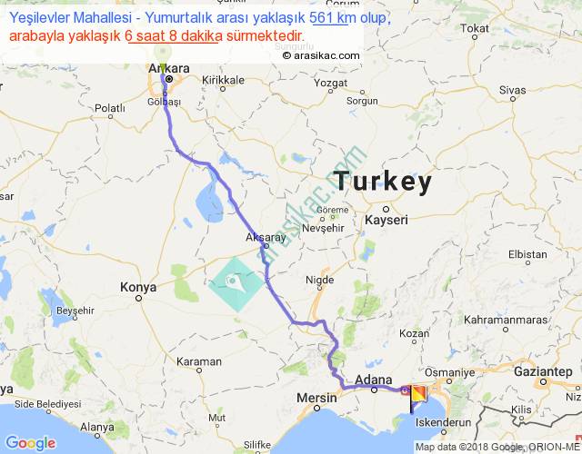 Yeşilevler Mahallesi - Yumurtalık arası yaklaşık olarak 90 km/h ile yukarıda belirtilen sürede olup, iki yerin kuş uçuşu uzaklığı (mesafesi) 440'dir. Eğer belirtilen yerler arasında uçak seferi var ise bu süre uçakla 40 dakika'ya kadar düşebilir. Yolculuk otobüsle 7 saat 58 dakika sürmektedir.