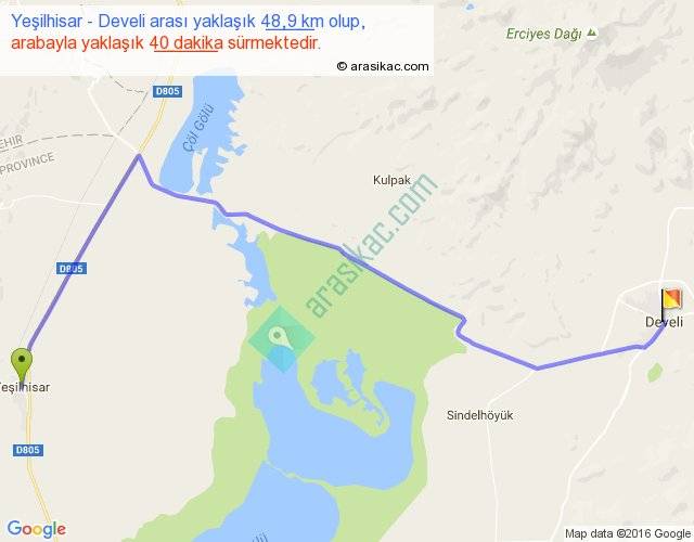 Yeşilhisar - Develi arası yaklaşık olarak 90 km/h ile yukarıda belirtilen sürede olup, iki yerin kuş uçuşu uzaklığı (mesafesi) 35'dir. Yolculuk otobüsle 52 dakika sürmektedir.