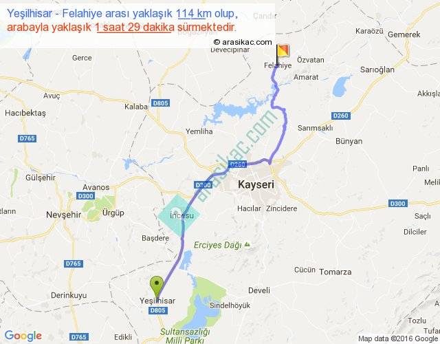 Yeşilhisar - Felahiye arası yaklaşık olarak 90 km/h ile yukarıda belirtilen sürede olup, iki yerin kuş uçuşu uzaklığı (mesafesi) 91'dir. Yolculuk otobüsle 1 saat 55 dakika sürmektedir.