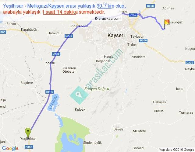 Yeşilhisar - Melikgazi Kayseri arası yaklaşık olarak 90 km/h ile yukarıda belirtilen sürede olup, iki yerin kuş uçuşu uzaklığı (mesafesi) 68'dir. Yolculuk otobüsle 1 saat 36 dakika sürmektedir.