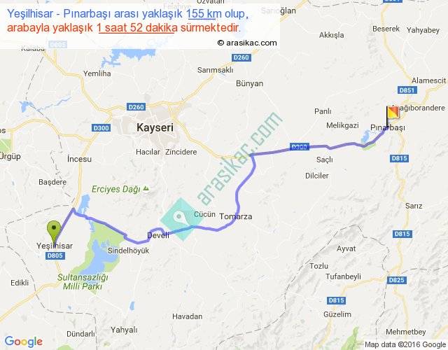 Yeşilhisar - Pınarbaşı arası yaklaşık olarak 90 km/h ile yukarıda belirtilen sürede olup, iki yerin kuş uçuşu uzaklığı (mesafesi) 120'dir. Yolculuk otobüsle 2 saat 25 dakika sürmektedir.