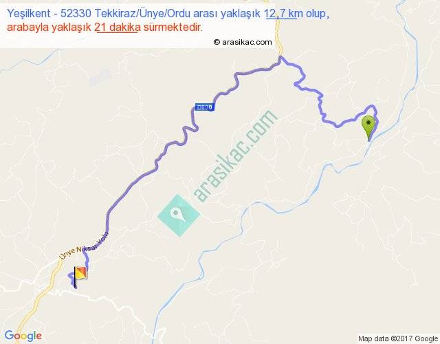 Yeşilkent - 52330 Tekkiraz Ünye Ordu arası yaklaşık olarak 90 km/h ile yukarıda belirtilen sürede olup, iki yerin kuş uçuşu uzaklığı (mesafesi) 7'dir. Yolculuk otobüsle 27 dakika sürmektedir.