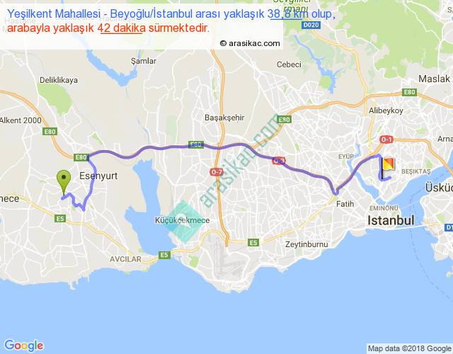Yeşilkent Mahallesi - Beyoğlu İstanbul arası yaklaşık olarak 90 km/h ile yukarıda belirtilen sürede olup, iki yerin kuş uçuşu uzaklığı (mesafesi) 26'dir. Yolculuk otobüsle 54 dakika sürmektedir.