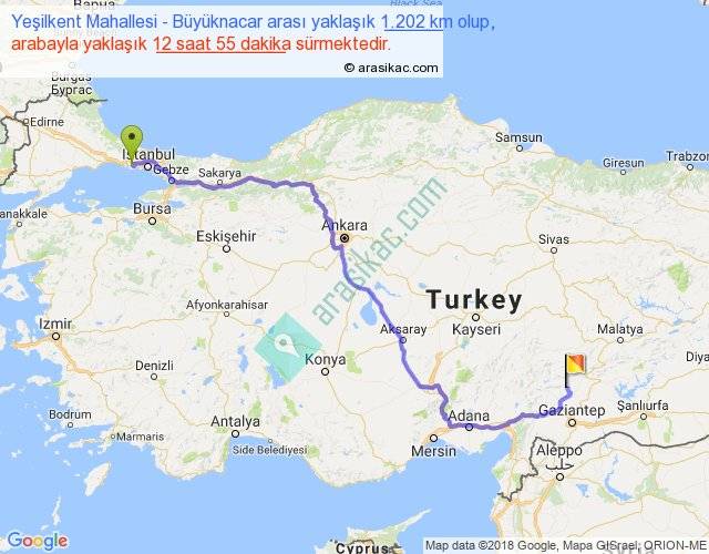 Yeşilkent Mahallesi - Büyüknacar arası yaklaşık olarak 90 km/h ile yukarıda belirtilen sürede olup, iki yerin kuş uçuşu uzaklığı (mesafesi) 828'dir. Eğer belirtilen yerler arasında uçak seferi var ise bu süre uçakla 1 saat 16 dakika'ya kadar düşebilir. Yolculuk otobüsle 16 saat 47 dakika sürmektedir.