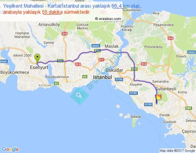 Yeşilkent Mahallesi - Kartal İstanbul arası yaklaşık olarak 90 km/h ile yukarıda belirtilen sürede olup, iki yerin kuş uçuşu uzaklığı (mesafesi) 47'dir. Yolculuk otobüsle 1 saat 11 dakika sürmektedir.