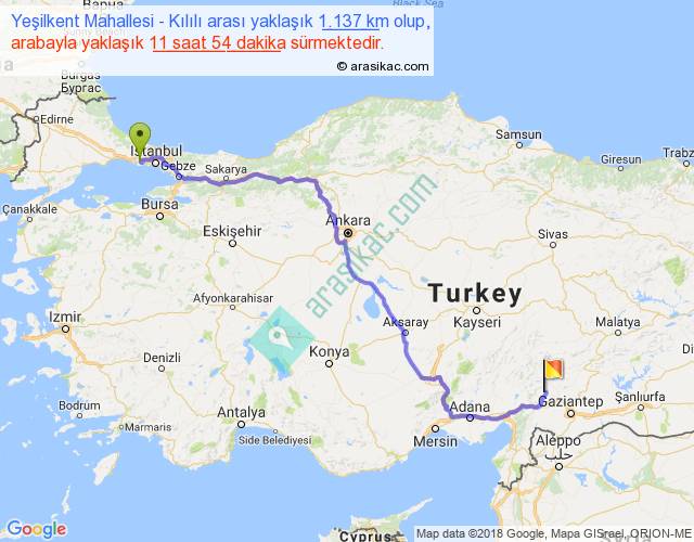 Yeşilkent Mahallesi - Kılılı arası yaklaşık olarak 90 km/h ile yukarıda belirtilen sürede olup, iki yerin kuş uçuşu uzaklığı (mesafesi) 809'dir. Eğer belirtilen yerler arasında uçak seferi var ise bu süre uçakla 1 saat 14 dakika'ya kadar düşebilir. Yolculuk otobüsle 15 saat 28 dakika sürmektedir.