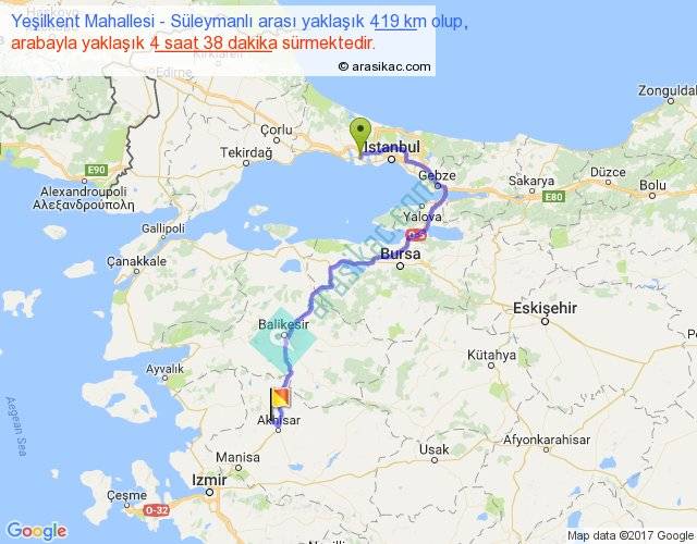 Yeşilkent Mahallesi - Süleymanlı arası yaklaşık olarak 90 km/h ile yukarıda belirtilen sürede olup, iki yerin kuş uçuşu uzaklığı (mesafesi) 238'dir. Yolculuk otobüsle 6 saat 1 dakika sürmektedir.