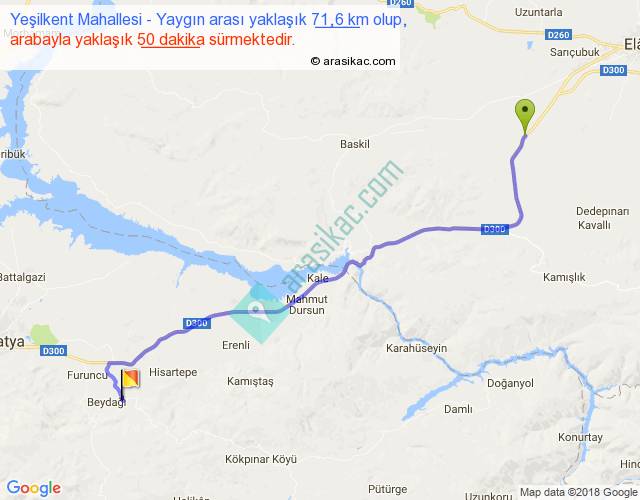 Yeşilkent Mahallesi - Yaygın arası yaklaşık olarak 90 km/h ile yukarıda belirtilen sürede olup, iki yerin kuş uçuşu uzaklığı (mesafesi) 57'dir. Yolculuk otobüsle 1 saat 5 dakika sürmektedir.
