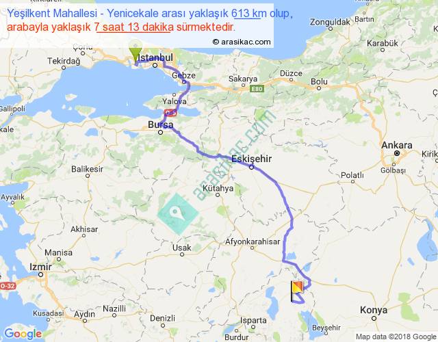Yeşilkent Mahallesi - Yenicekale arası yaklaşık olarak 90 km/h ile yukarıda belirtilen sürede olup, iki yerin kuş uçuşu uzaklığı (mesafesi) 390'dir. Eğer belirtilen yerler arasında uçak seferi var ise bu süre uçakla 36 dakika'ya kadar düşebilir. Yolculuk otobüsle 9 saat 22 dakika sürmektedir.