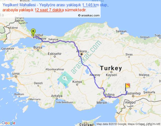 Yeşilkent Mahallesi - Yeşilyöre arası yaklaşık olarak 90 km/h ile yukarıda belirtilen sürede olup, iki yerin kuş uçuşu uzaklığı (mesafesi) 799'dir. Eğer belirtilen yerler arasında uçak seferi var ise bu süre uçakla 1 saat 13 dakika'ya kadar düşebilir. Yolculuk otobüsle 15 saat 45 dakika sürmektedir.