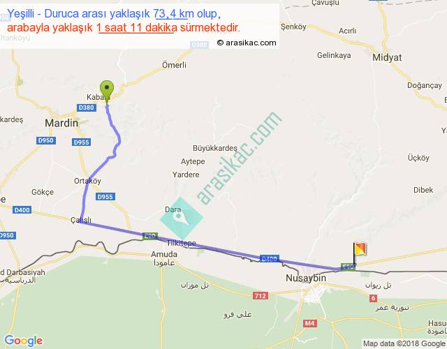 Yeşilli - Duruca arası yaklaşık olarak 90 km/h ile yukarıda belirtilen sürede olup, iki yerin kuş uçuşu uzaklığı (mesafesi) 51'dir. Yolculuk otobüsle 1 saat 32 dakika sürmektedir.