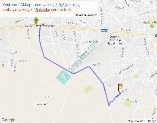 Yeşiloba - Akkapı arası yaklaşık olarak 90 km/h ile yukarıda belirtilen sürede olup, iki yerin kuş uçuşu uzaklığı (mesafesi) 6'dir. Yolculuk otobüsle 19 dakika sürmektedir.