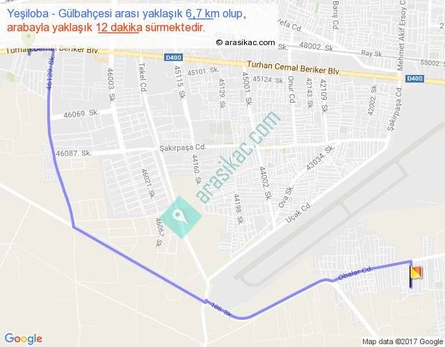 Yeşiloba - Gülbahçesi arası yaklaşık olarak 90 km/h ile yukarıda belirtilen sürede olup, iki yerin kuş uçuşu uzaklığı (mesafesi) 5'dir. Yolculuk otobüsle 15 dakika sürmektedir.