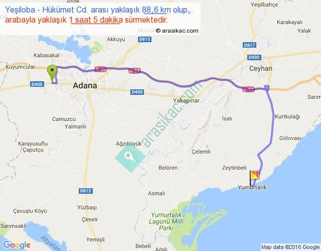 Yeşiloba - Hükümet Cd. arası yaklaşık olarak 90 km/h ile yukarıda belirtilen sürede olup, iki yerin kuş uçuşu uzaklığı (mesafesi) 54'dir. Yolculuk otobüsle 1 saat 24 dakika sürmektedir.