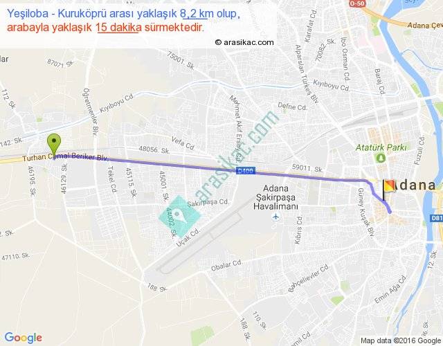 Yeşiloba - Kuruköprü arası yaklaşık olarak 90 km/h ile yukarıda belirtilen sürede olup, iki yerin kuş uçuşu uzaklığı (mesafesi) 7'dir. Yolculuk otobüsle 19 dakika sürmektedir.