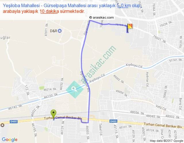 Yeşiloba Mahallesi - Gürselpaşa Mahallesi arası yaklaşık olarak 90 km/h ile yukarıda belirtilen sürede olup, iki yerin kuş uçuşu uzaklığı (mesafesi) 3'dir. Yolculuk otobüsle 13 dakika sürmektedir.