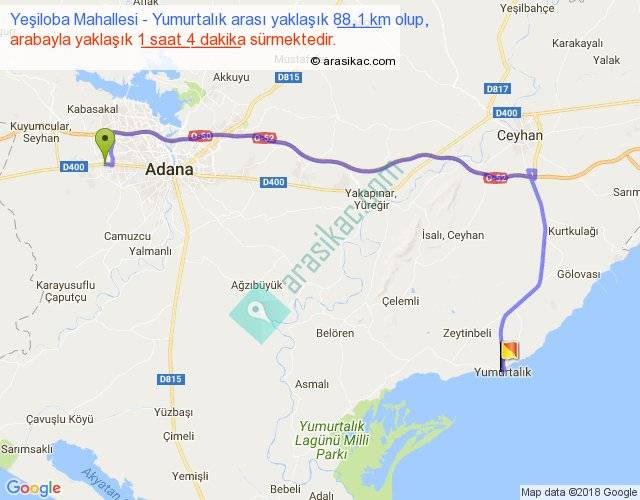 Yeşiloba Mahallesi - Yumurtalık arası yaklaşık olarak 90 km/h ile yukarıda belirtilen sürede olup, iki yerin kuş uçuşu uzaklığı (mesafesi) 54'dir. Yolculuk otobüsle 1 saat 23 dakika sürmektedir.