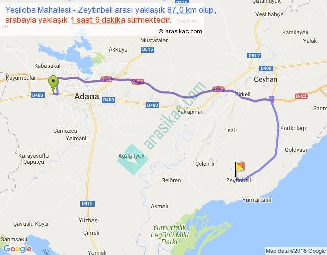 Yeşiloba Mahallesi - Zeytinbeli arası yaklaşık olarak 90 km/h ile yukarıda belirtilen sürede olup, iki yerin kuş uçuşu uzaklığı (mesafesi) 48'dir. Yolculuk otobüsle 1 saat 25 dakika sürmektedir.