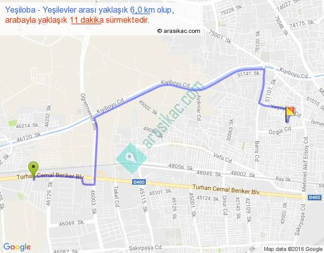 Yeşiloba - Yeşilevler arası yaklaşık olarak 90 km/h ile yukarıda belirtilen sürede olup, iki yerin kuş uçuşu uzaklığı (mesafesi) 4'dir. Yolculuk otobüsle 14 dakika sürmektedir.
