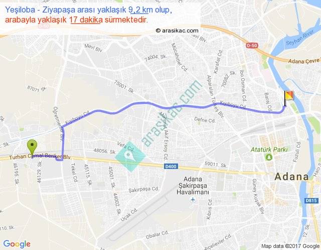 Yeşiloba - Ziyapaşa arası yaklaşık olarak 90 km/h ile yukarıda belirtilen sürede olup, iki yerin kuş uçuşu uzaklığı (mesafesi) 8'dir. Yolculuk otobüsle 22 dakika sürmektedir.