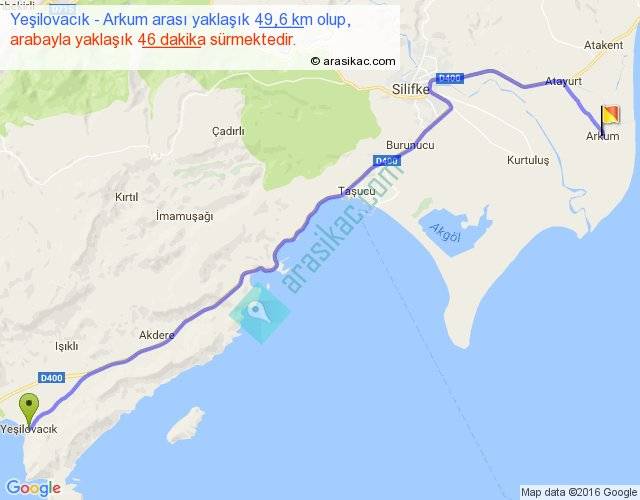Yeşilovacık - Arkum arası yaklaşık olarak 90 km/h ile yukarıda belirtilen sürede olup, iki yerin kuş uçuşu uzaklığı (mesafesi) 39'dir. Yolculuk otobüsle 59 dakika sürmektedir.