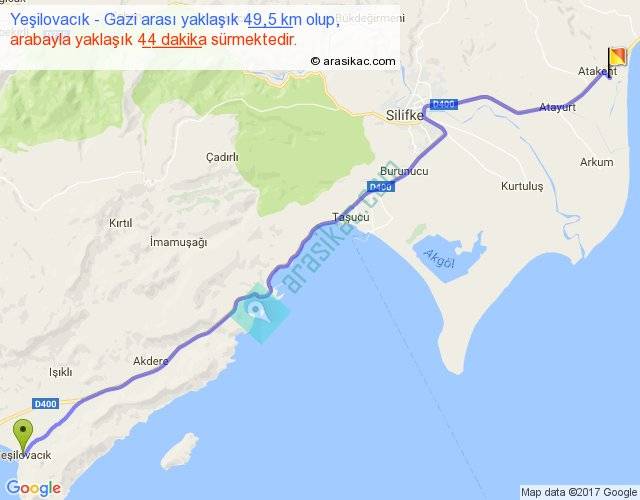 Yeşilovacık - Gazi arası yaklaşık olarak 90 km/h ile yukarıda belirtilen sürede olup, iki yerin kuş uçuşu uzaklığı (mesafesi) 43'dir. Yolculuk otobüsle 57 dakika sürmektedir.