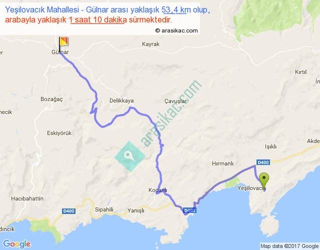 Yeşilovacık Mahallesi - Gülnar arası yaklaşık olarak 90 km/h ile yukarıda belirtilen sürede olup, iki yerin kuş uçuşu uzaklığı (mesafesi) 30'dir. Yolculuk otobüsle 1 saat 31 dakika sürmektedir.